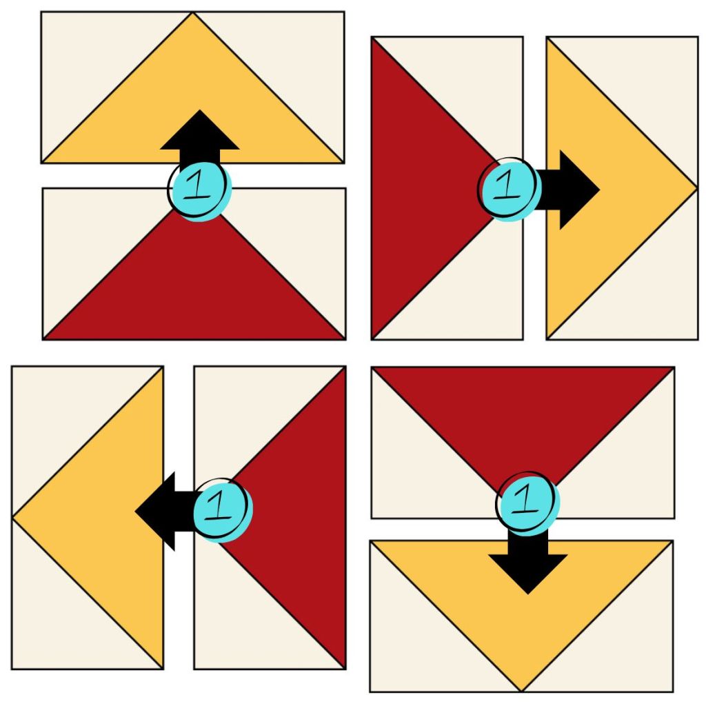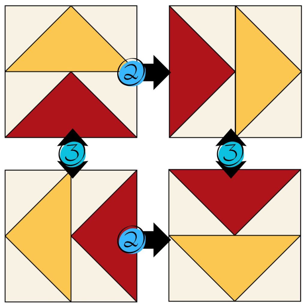 9 – Arrange: Arrange the completed Flying Geese units as shown in the diagram. Assemble and complete your 12.5” block.