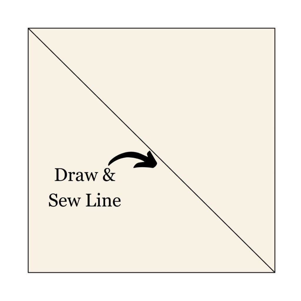 3 – Lay Out: Lay the background square, right sides together on one end of the 3.5” x 6.5” piece as shown in the diagram. The marked diagonal line should be in the middle of the 6.5” piece going to the outside corner (See diagram)