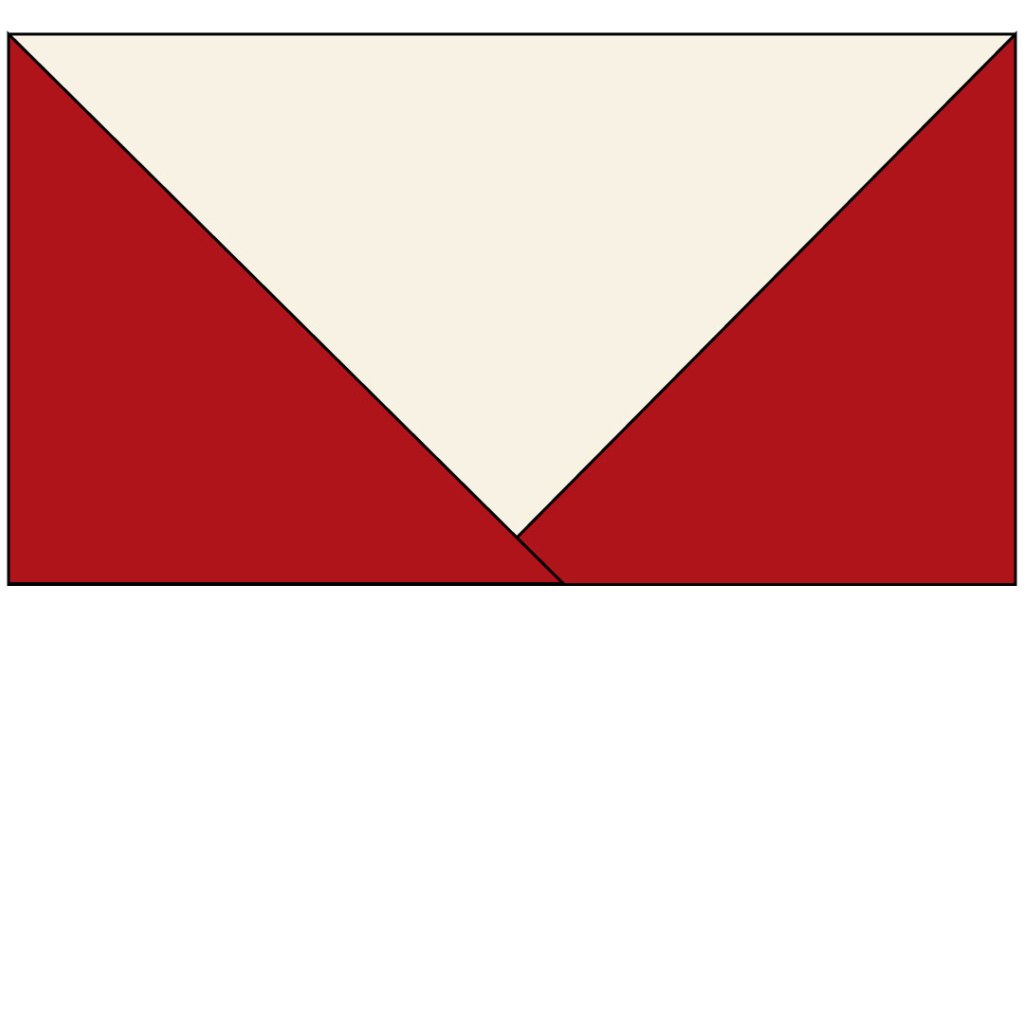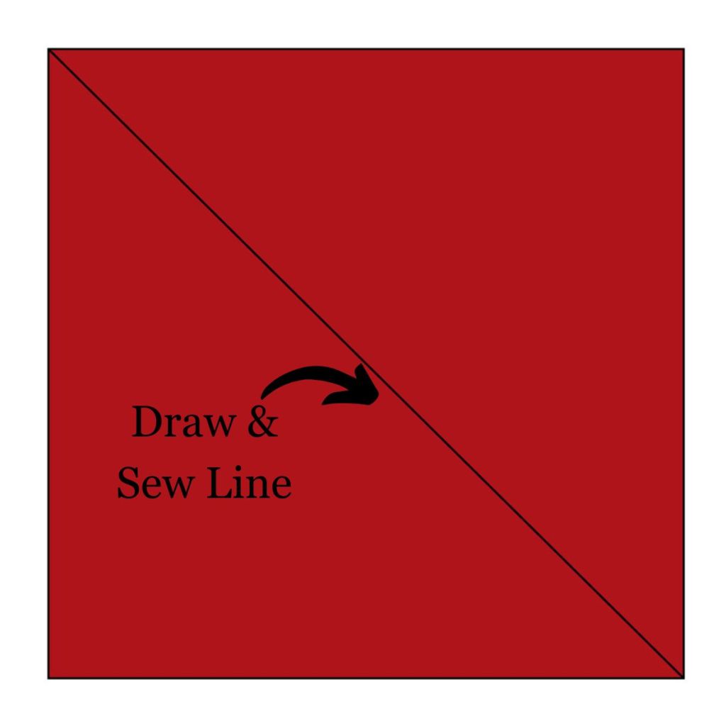 9 – Lay Out: Lay the remaining Fabric Two squares, right sides together on the opposite end of the rectangle. The marked diagonal line should be in the middle just overlapping the first block sewn, going to the outside corner. (See the diagram.)