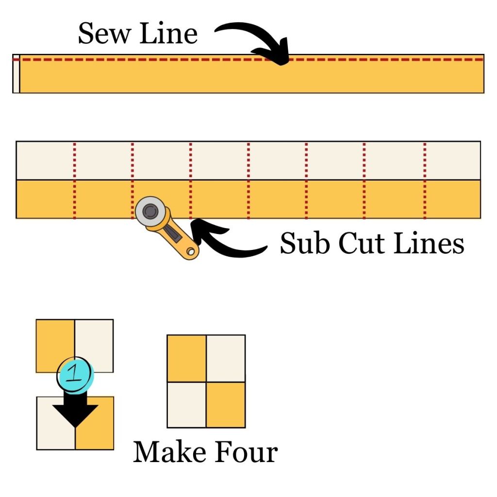 3 – Sub Cut: Sub cut the strip into (8) 2 ½ inch wide units. They should measure 2 ½ inches wide by 4 ½ inches tall.